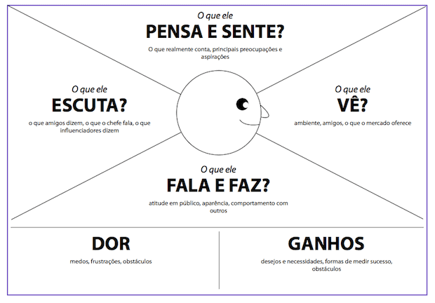 Agora, equipado com todas as informações necessárias para criar uma Persona, você pode usar o Mapa de Empatia, uma ótima ferramenta do Design Thinking.